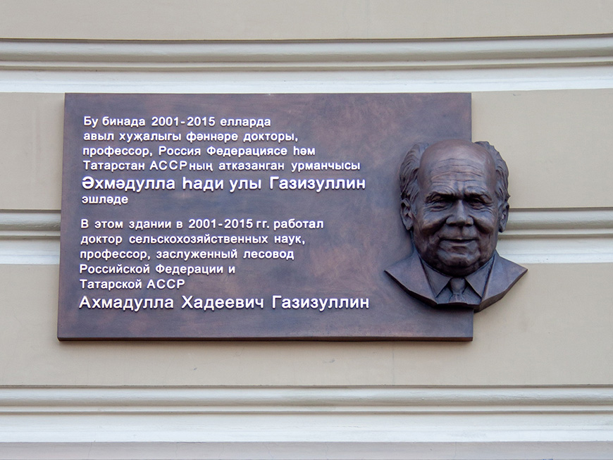 Сегодня, в День леса, в Казани была открыта мемориальная доска в честь заслуженного лесовода РФ Ахмадуллы Газизуллина. Ее установили на фасаде здания №65 по улице Карла Маркса, в котором расположен Казанский государственный аграрный университет.Памятная доска с барельефом появилась возле главного входа в вуз, где работал Ахмадулла Газизуллин с 2001 по 2015 год. Именно его стараниями в КГАУ образовали факультет лесного хозяйства и экологии.