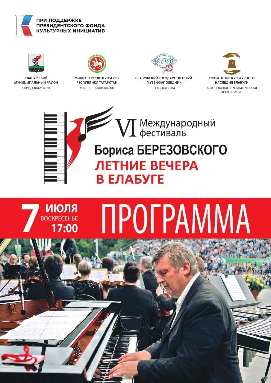 Напомним, что телеканал "Елабуга 24" будет вести прямую трансляцию с концерта на своём ютьюб-канале. Для вас, публикуем программу заключительного концертного вечера VI Международного фестиваля Бориса Березовского "Летние вечера в Елабуге".